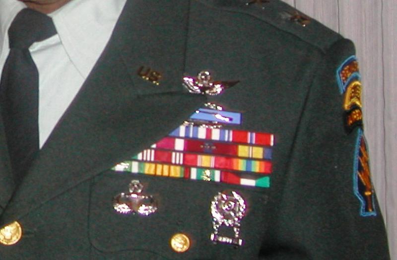 Left chest-Appears to be a Presidential Medal of Freedom or DFC in front of a Silver Star ?, BSM, MSM, Marine Corps Good Conduct Medal? (not a Legion of Merit), Combat Action Ribbon (backwards), ARCOM?, Army Good Conduct Medal, National Defense Ribbon, Army Service Ribbon, Republic of Vietnam Campaign Medal, Vietnam Service Medal (wrong order), Kuwait Liberation Medal, Kuwait Liberation Medal. Also the Aviator Wings should be below the CIB.