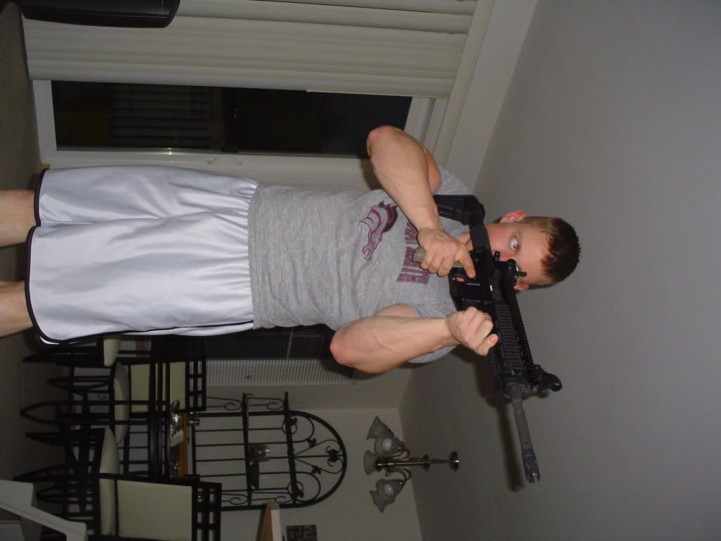 Here's a pic of me with my new appendage, the POF 415. Please forgive the silly bed time outfit, it was my first hour with the weapon put together and I was a touch excited  No optics yet, I've put enough money stress into the equation for a while (so says the Home 6 element). The new gas piston system is extremely impressive, I have found no loss of accuracy; no variance in recoil. Had 1 hiccup from a magazine error; tested the same mag in two carbines with the same result...HK mag, odd huh? POF makes a good weapon...be prepared to wait for it though! I originally ordered mine in the 3rd week of Dec 06 and didn't get her in my hands till the last week of May 07. I was supplied a free front sight for waiting, and they do military discounts guys and gals. My setup is running great and my only complaint so far is that the OLY-arms safety selector that I used has a little play (looseness). BTW the specs: