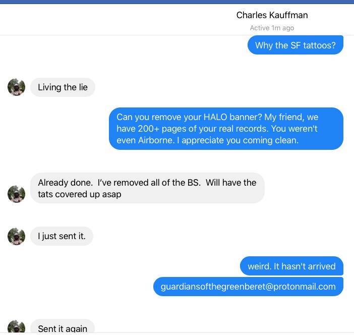 We have been working Charle Kauffman fake Green Beret for over a year. He's made a decent living as a contractor based on his false claims of being an 18D. The article below shows about 40 pictures along with an in-depth narrative of his claims, years, and a screen shot of 200 pages we have of his actual military service.